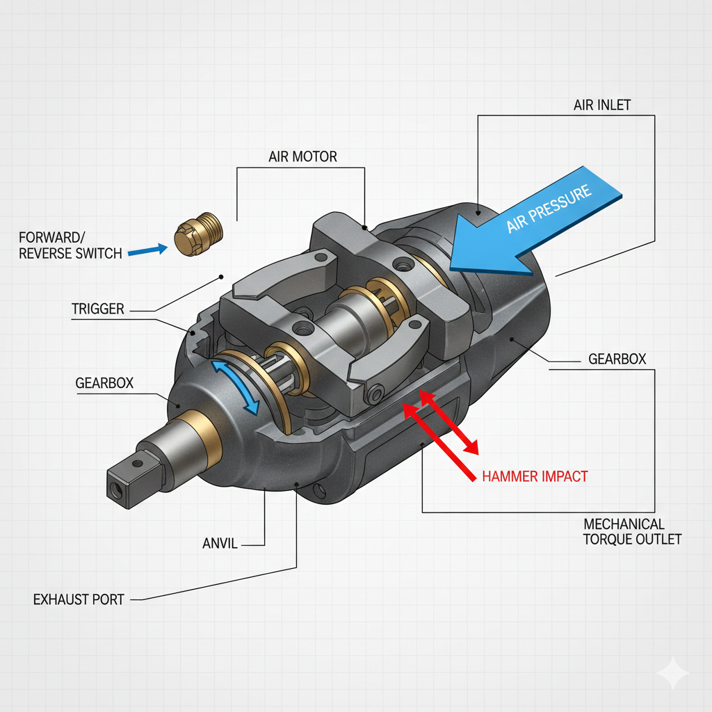 마음 공압 임팩트 렌치 공기 모터입니다. 사용자가 방아쇠를 당기면 압축 공기가 도구에 들어가 로터를 회전시킵니다. 이 로터는 일반적으로 트윈 해머 또는 락킹 도그 디자인인 "충격 메커니즘"에 연결됩니다. 로터가 회전하면서 운동 에너지가 생성됩니다. 볼트의 저항이 모터의 회전력보다 높아지면 내부 해머가 출력 샤프트(앤빌)를 타격하여 갑자기 엄청난 회전력을 전달합니다. 이런 일이 분당 수백 번, 심지어 수천 번 발생합니다.
